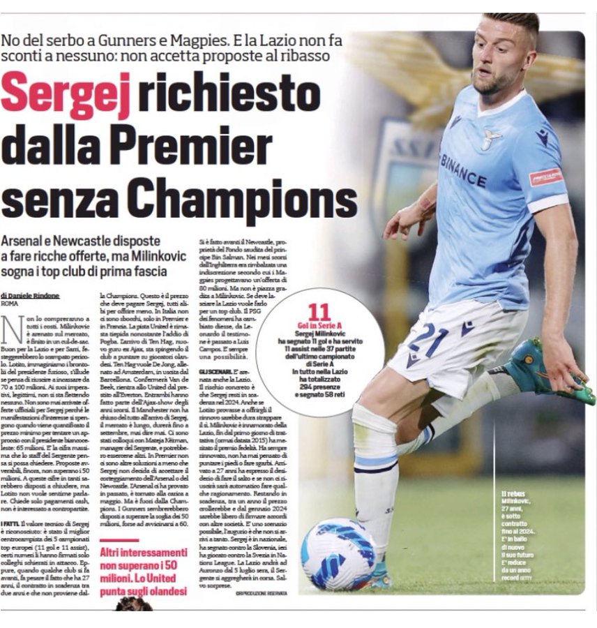 In a recent print edition, Corriere dello Sport revealed that Arsenal have reignited their interest in Lazio midfielder Sergej Milinković-Savić. It has been mentioned that the Gunners are hoping to move in for the Serbia international with the Italian outfit demanding €65m for his services this summer.