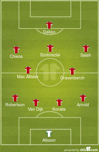 While Virgil van Dijk is continuing at the heart of the defence, Jarell Quansah makes way for Ibrahima Konate into the XI. Andy Robertson is also likely to regain his left full-back role, sending Kostas Tsimikas back on the bench.