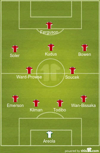 Jarrod Bowen continues to operate on the right flank while Carlos Soler comes into the XI at the expense of Scarles for the left wing role. The hero of the last game, Mohammed Kudus is again playing as the attacking midfielder.