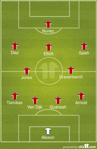 The super-sub and the sole scorer, Harvey Elliott could be rewarded with a start this weekend. He will replace Dominik Szoboszlai in the lineup. Interestingly, Darwin Nunez is the number nine for this fixture ahead of Diogo Jota.