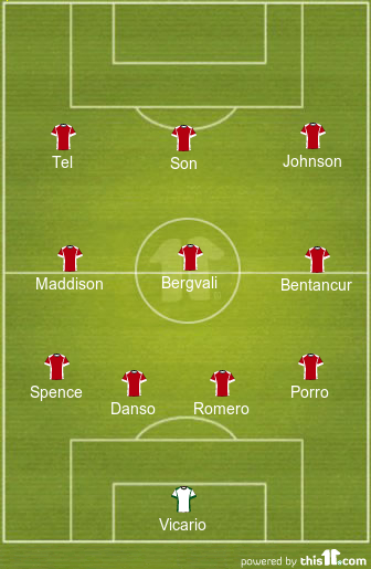 Cristian Romero could be starting in the centre of the defence alongside Kevin Danso. The former recently returned from an injury and might come at the expense of Archie Gray. Destiny Udogie is also expected to make way for Djed Spence at the left-back spot.