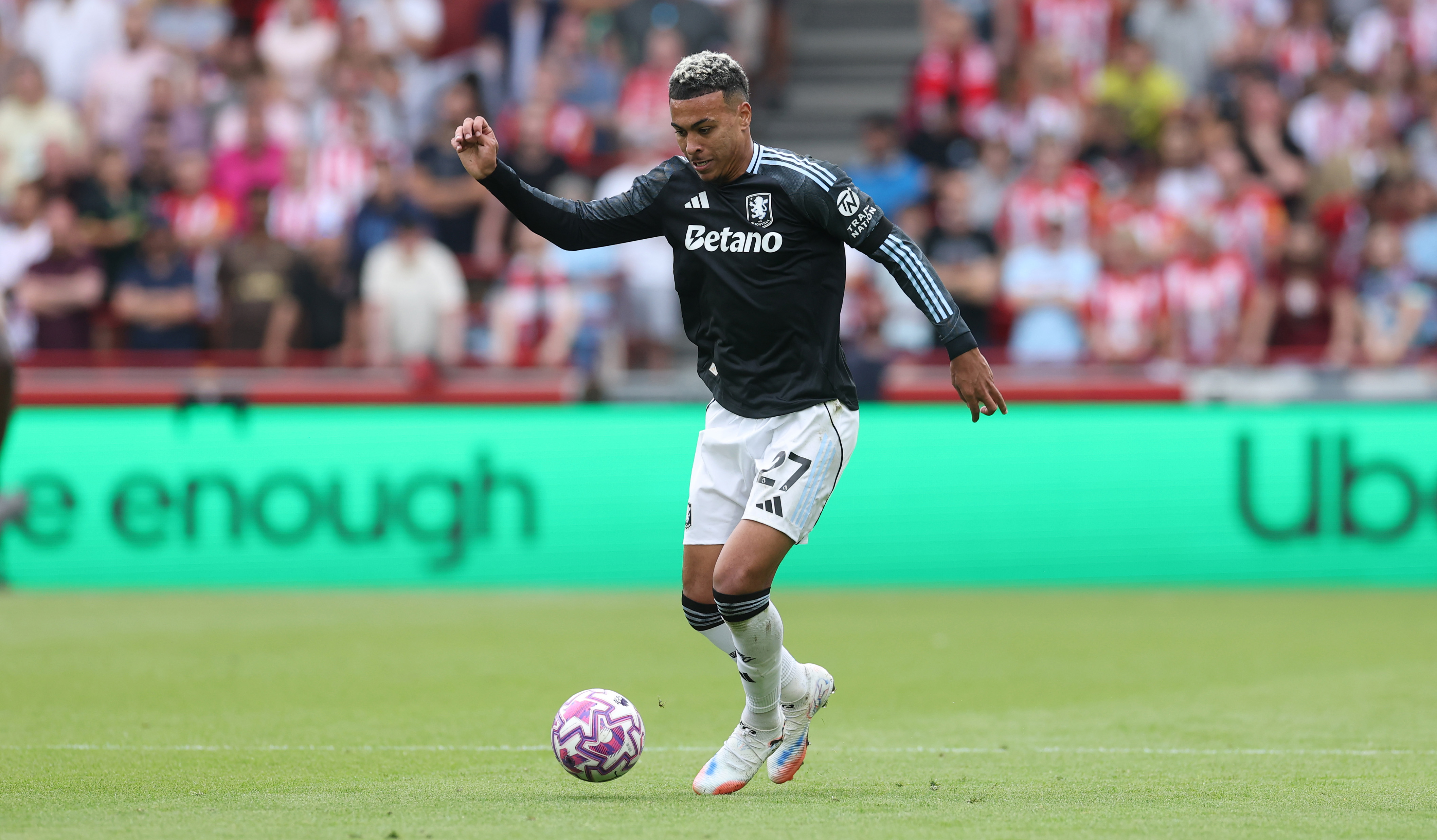 BRENTFORD, ENGLAND – AUGUST 23: Morgan Rogers of Aston Villa is challenged by Jordan Henderson of Brentford during the Premier League match between Brentford and Aston Villa at Gtech Community Stadium on August 23, 2025 in Brentford, England. (Photo by Steve Bardens/Getty Images)