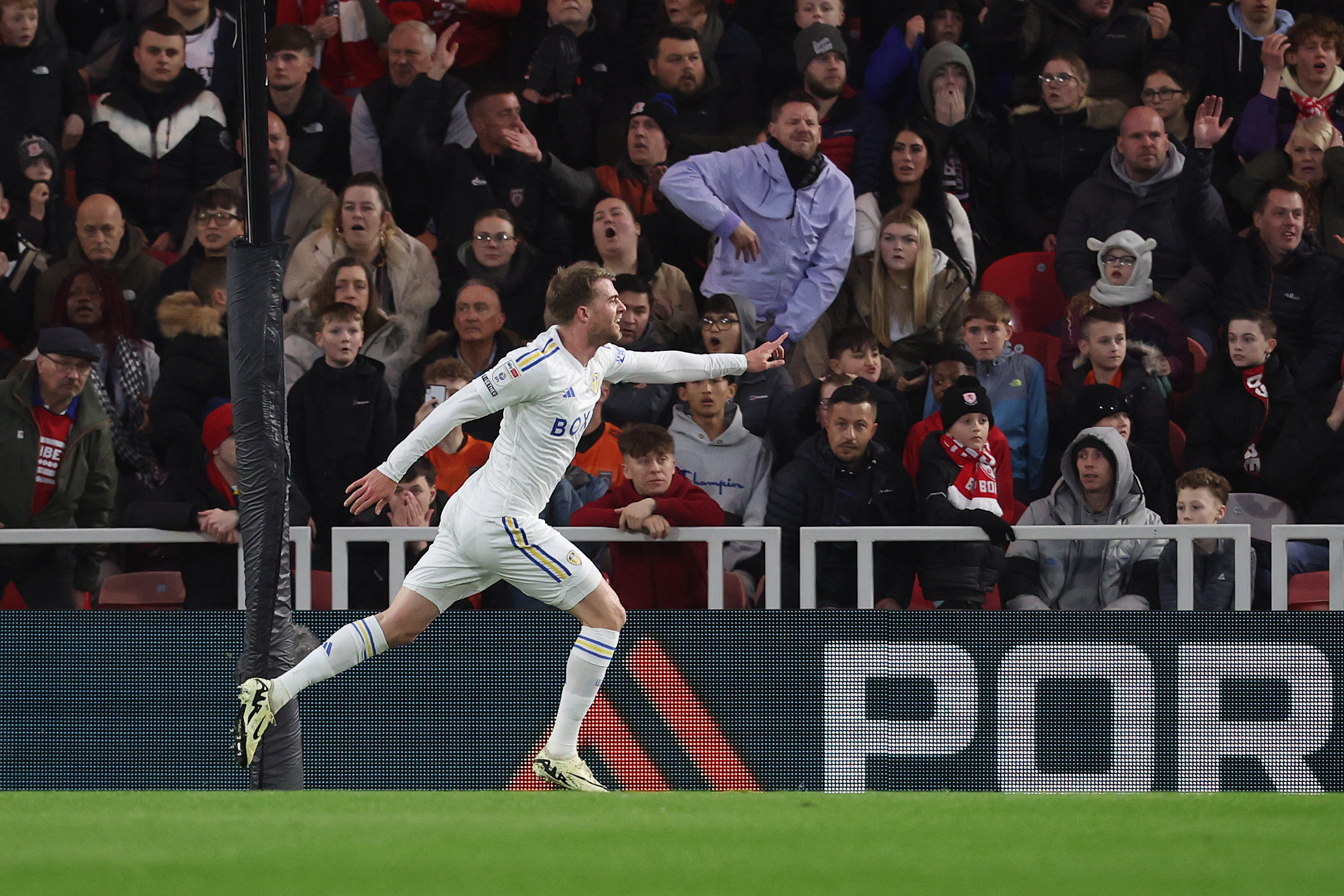 LEEDS, ENGLAND – FEBRUARY 10: Patrick Bamford of Leeds United celebrates scoring his team’s first goal with teammates during the Sky Bet Championship match between Leeds United and Rotherham United at Elland Road on February 10, 2024 in Leeds, England. (Photo by George Wood/Getty Images)