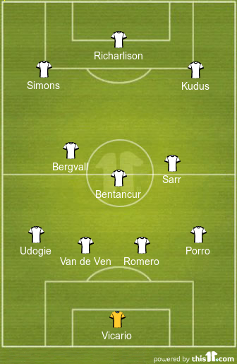 Thomas Frank will opt for the 4-3-3 formation and is expected to make some changes to his first XI for this game. Richarlison, Rodrigo Bentancur and Destiny Udogie could all play from the start of this contest.
