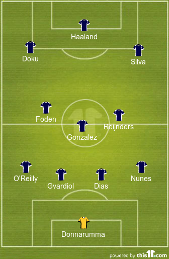Guardiola will opt for a midfield three of Phil Foden, Nico Gonzalez and Tijjani Reijnders for this game. All three of them need to retain possession well in the middle of the park and orchestrate some clear-cut chances in the final third.