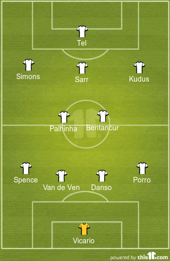Mathys Tel will lead the charge for the North London club up top. He would be eager to get his name on the scoresheet after being rested in midweek.