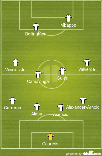 Eduardo Camavinga and Arda Guler will operate as the box-to-box midfielders for Los Blancos as they look to create some inviting chances in the final third.