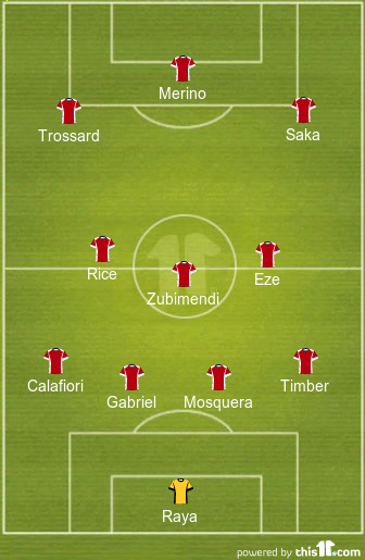 Mikel Arteta will once again set his players up in a 4-3-3 formation and is expected to make a few tweaks to his first team for this clash. Riccardo Calafiori, Eberechi Eze and Martin Zubimendi could all play from the start of this game.