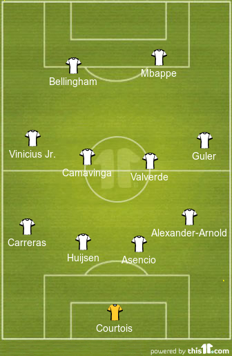 Vinicius Junior will try to put his pace to good use on the left flank, while Arda Guler hopes to impress as the right-winger. Both of them will look to make some overlapping runs out in the wide areas.