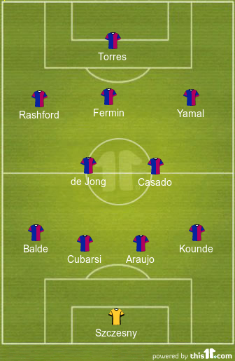 Hansi Flick will opt for the 4-2-3-1 formation and is expected to make one change to his starting XI for this game. Pau Cubarsi could get a chance to impress from the start of this contest.