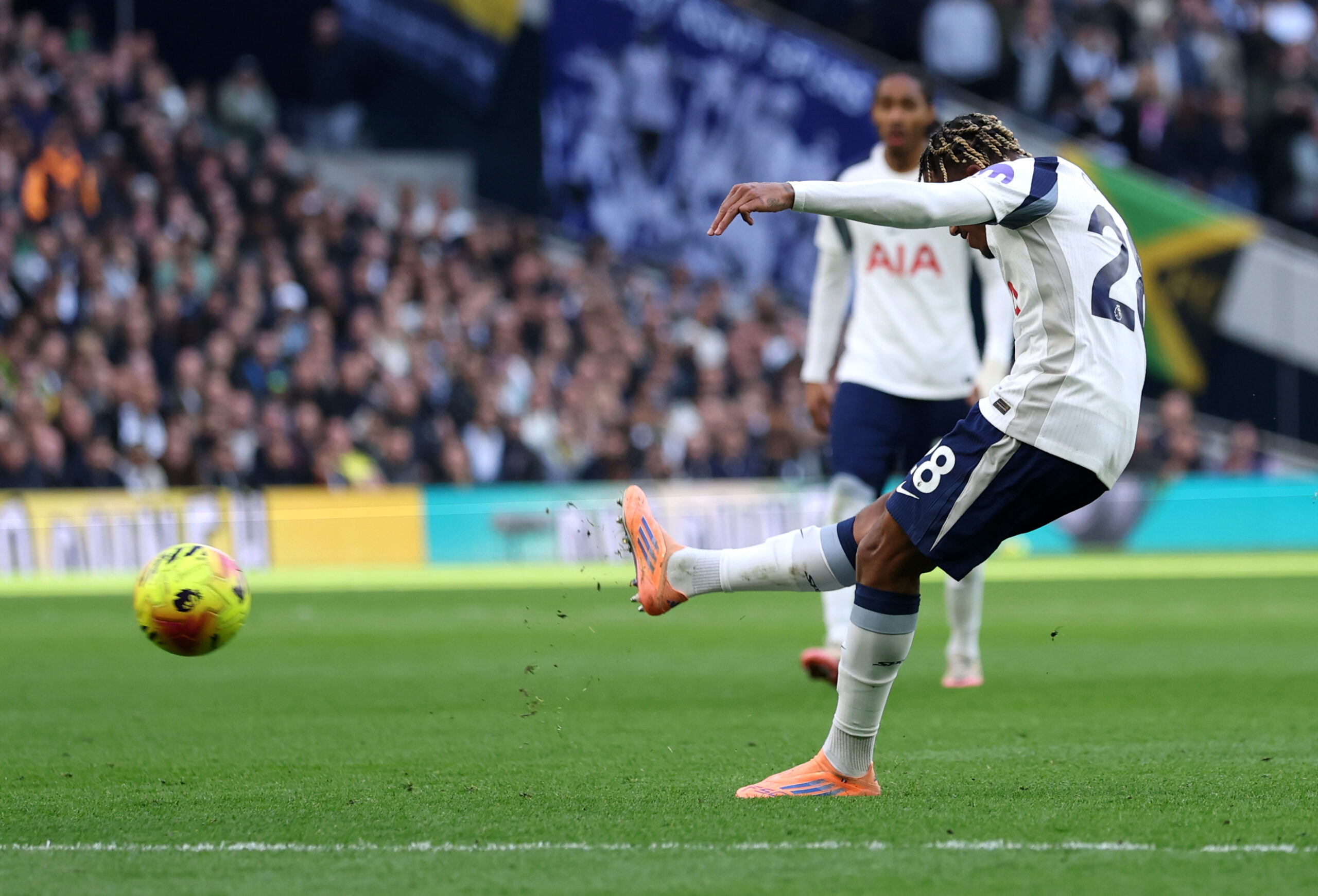 LONDON, ENGLAND – NOVEMBER 08: Mathys Tel of Tottenham Hotspur celebrates scoring his team’s first goal during the Premier League match between Tottenham Hotspur and Manchester United at the Tottenham Hotspur Stadium on November 08, 2025 in London, England. (Photo by Alex Pantling/Getty Images)