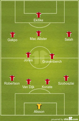 Arne Slot will set his players up in a 4-2-3-1 formation and is expected to make a couple of changes to his first team for this game. Both Andy Robertson and Hugo Ekitike could play from the start of this contest.