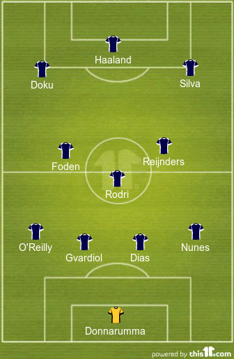 Jeremy Doku will hope to give a good account of himself on the left flank, while Bernardo Silva looks to impress as the right-sided wide player.