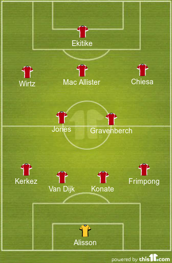Arne Slot will set his players up in a 4-2-3-1 formation and is expected to make some tweaks to his first team for this clash. Federico Chiesa and Jeremie Frimpong could both play from the start of this game.