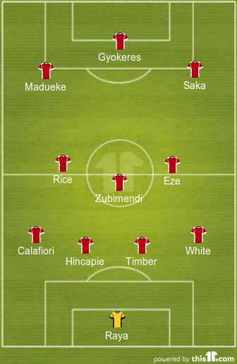 Mikel Arteta will set his side up in a 4-3-3 formation and is expected to make some tweaks to his first team for this clash. Viktor Gyokeres, Bukayo Saka and Eberechi Eze could all play from the start of this game.