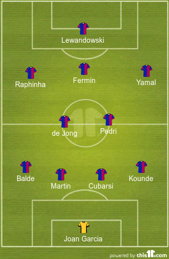 Joan Garcia will function in between the sticks for the Catalan club after shipping in three goals in his last appearance. Pau Cubarsi will operate alongside Gerard Martin at the centre of the Barcelona backline as they look to keep a good shape on the defensive end of the field.