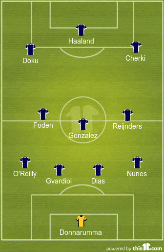 Pep Guardiola will set his players up in a 4-3-3 formation and is expected to make one change to his first team for this clash. Tijjani Reijnders could play from the start of this game, while Bernardo Silva makes way for him and drops to the bench.