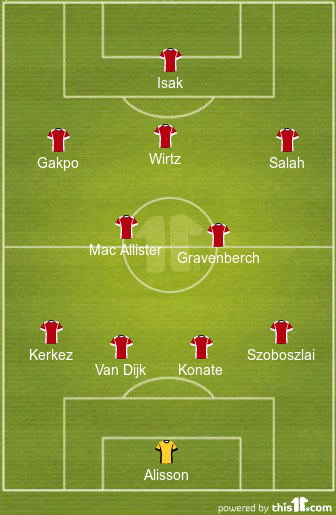 Arne Slot will set his men up in a 4-2-3-1 formation and is expected to make one change to his first XI for this contest. Mohamed Salah could play from the start of this game, while Joe Gomez makes way for him and drops to the bench.
