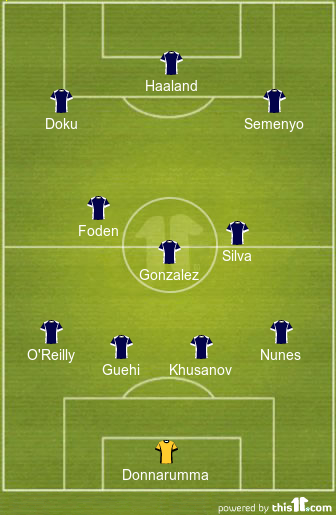 Jeremy Doku will hope to prove his worth on the left flank, while Antoine Semenyo looks to give a good account of himself as the right-sided wide player.