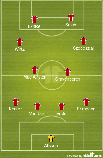 Florian Wirtz will act as the left-sided attacking midfielder, while Dominik Szoboszlai looks to weave his magic from the right. Both of them will have to carry most of the creative burden for Liverpool in the final third.