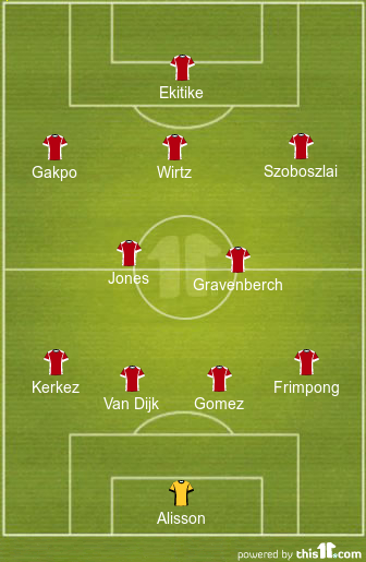 Arne Slot will set his men up in a 4-2-3-1 formation once again and could make a couple of changes to his first XI for this game. Both Cody Gakpo and Curtis Jones are expected to play from the start of this clash.