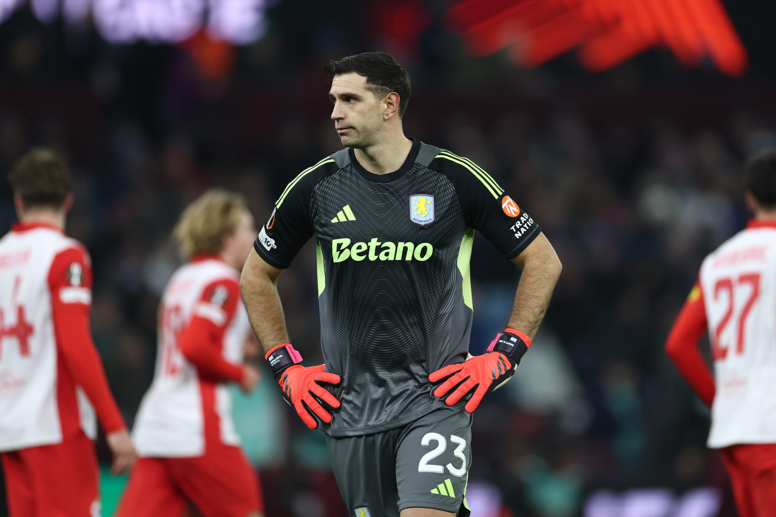 BIRMINGHAM, ENGLAND – JANUARY 29: Emi Buendia of Aston Villa shoots whilst under pressure from Soumaila Diabate of FC Salzburg during the UEFA Europa League 2025/26 League Phase MD8 match between Aston Villa FC and FC Salzburg at Villa Park on January 29, 2026 in Birmingham, England. (Photo by Dan Istitene/Getty Images)