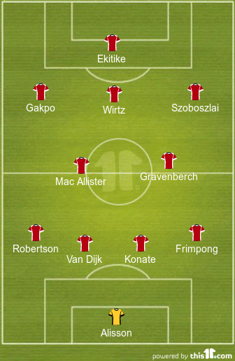 Arne Slot will set his side up in a 4-2-3-1 formation and is expected to make one change to his first XI for this game. Alexis Mac Allister and Andy Robertson could play from the start of this contest, while Curtis Jones and Milos Kerkez make way for them and drop to the bench.