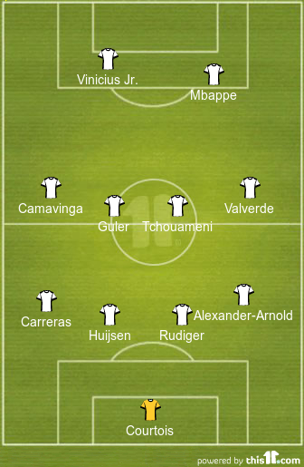 Arda Guler and Aurelien Tchouameni will play as the central midfielders for the Madrid giants as they focus on winning the 50-50 battles at the centre of the park.