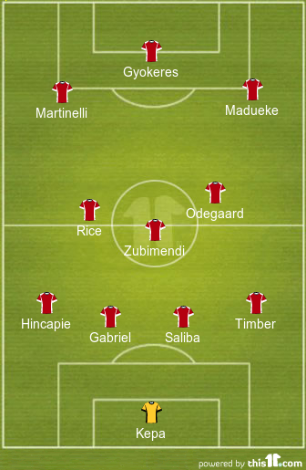 Gabriel Martinelli will try to give a good account of himself on the left flank, while Noni Madueke looks to put his pace to good use on the right-wing.
