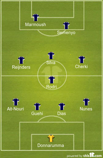 Pep Guardiola will set his side up in a 4-1-3-2 formation and is expected to make one change to his first XI for this clash. Tijjani Reijnders could get a chance to impress from the start of this contest because Nico O’Reilly is a doubt for this game.