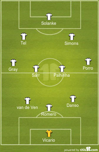 Guglielmo Vicario will operate in goal for the North London club after he shipped in three goals in his last outing for the London club. Tudor could opt for a back three of Micky van de Ven, Cristian Romero and Kevin Danso for this game.