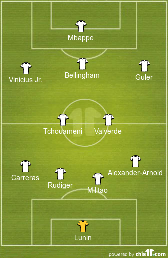 Andriy Lunin will operate in between the sticks for Los Blancos after conceding four goals in his last outing. Antonio Rudiger will play alongside Eder Militao at the heart of Arbeloa’s defence as they focus on keeping a solid shape at the back during the 90 minutes.
