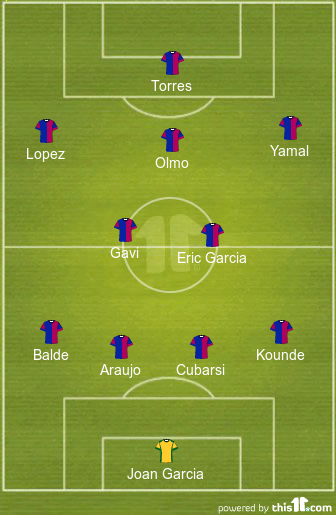 Hansi Flick will opt for the 4-2-3-1 formation and is expected to make a few changes to his first team for this game. Gavi, Alejandro Balde and Fermin Lopez could all play from the start of this clash.
