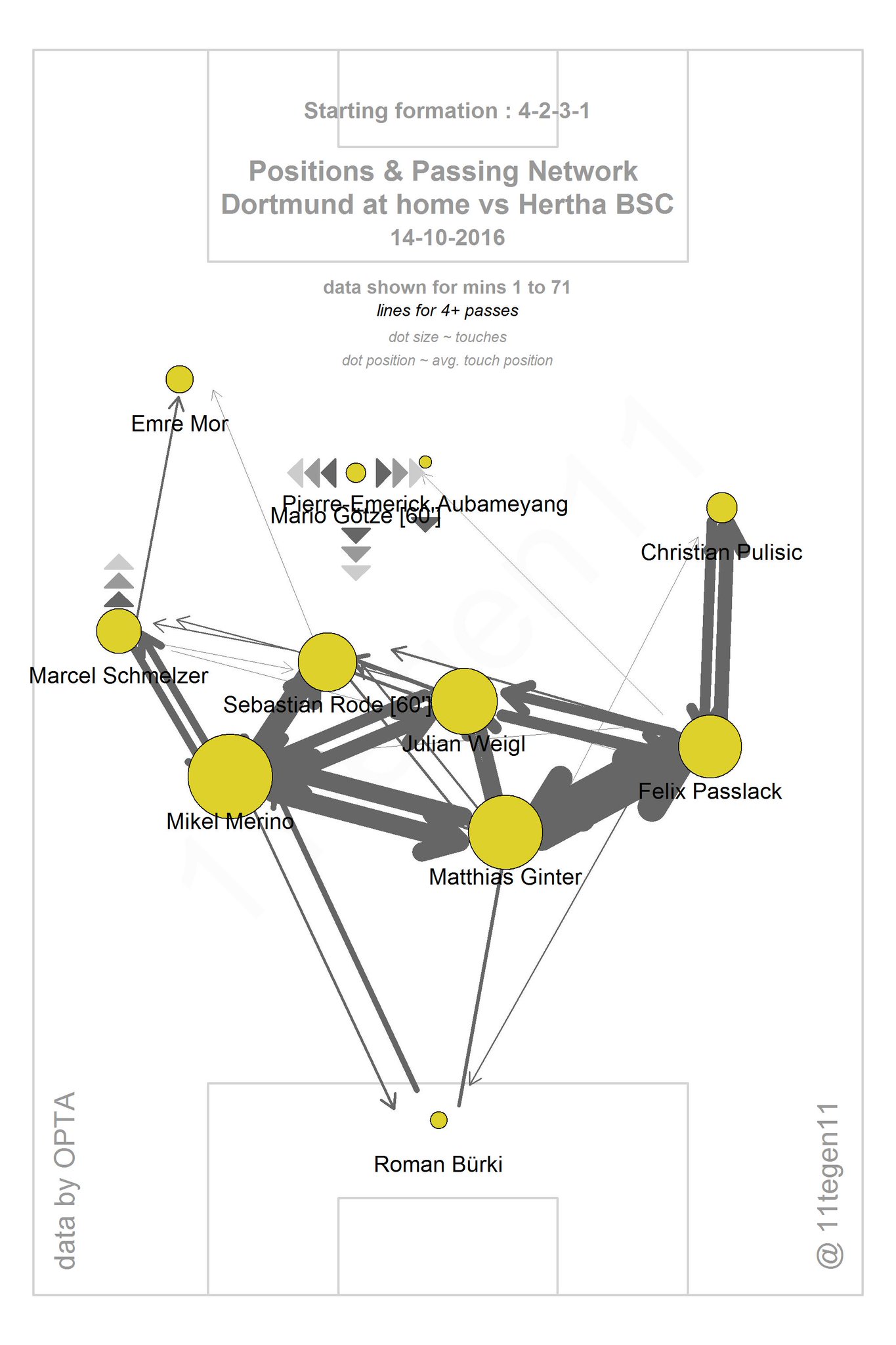 Dortmund started the game with quick fettle, subtle passing but the rigid Hertha formation took shape as the game went on. The left sided centre back Mikel Merino converted to a more wide positioning and Ginter stayed centrally with Sebastian Rode occasionally dropping deep to link up the play with Julian Weigl, who was monitored quite often by Per Skjelbred.